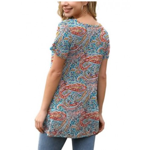 30 Flower Cashew Blue GreenWomens Summer Short Sleeve Tunic Tops Loose Fit Casual T-Shirt Button Up Blouses
